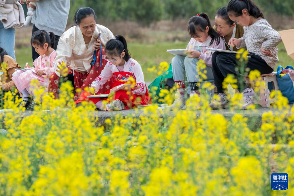 3月1日,小朋友在廣西梧州市龍圩區龍圩鎮念村稻漁綜合種養示范基地油菜花田寫生。