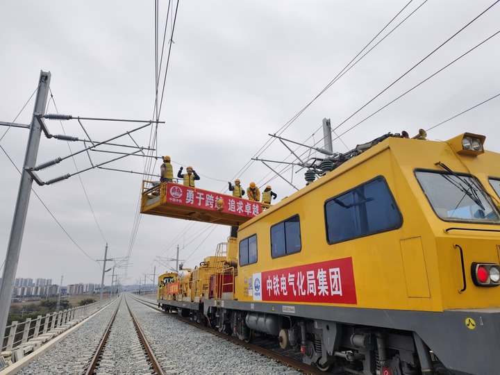 “接觸網導線架設是牽引供電工程施工的關鍵環節,我們堅持高標準、嚴要求,采用先進工藝工法,每天大約能架設接觸網導線6條公里,預計今年4月底完成全線架設任務?!敝需F電氣化局崇憑鐵路項目總工程師楊子安表示。