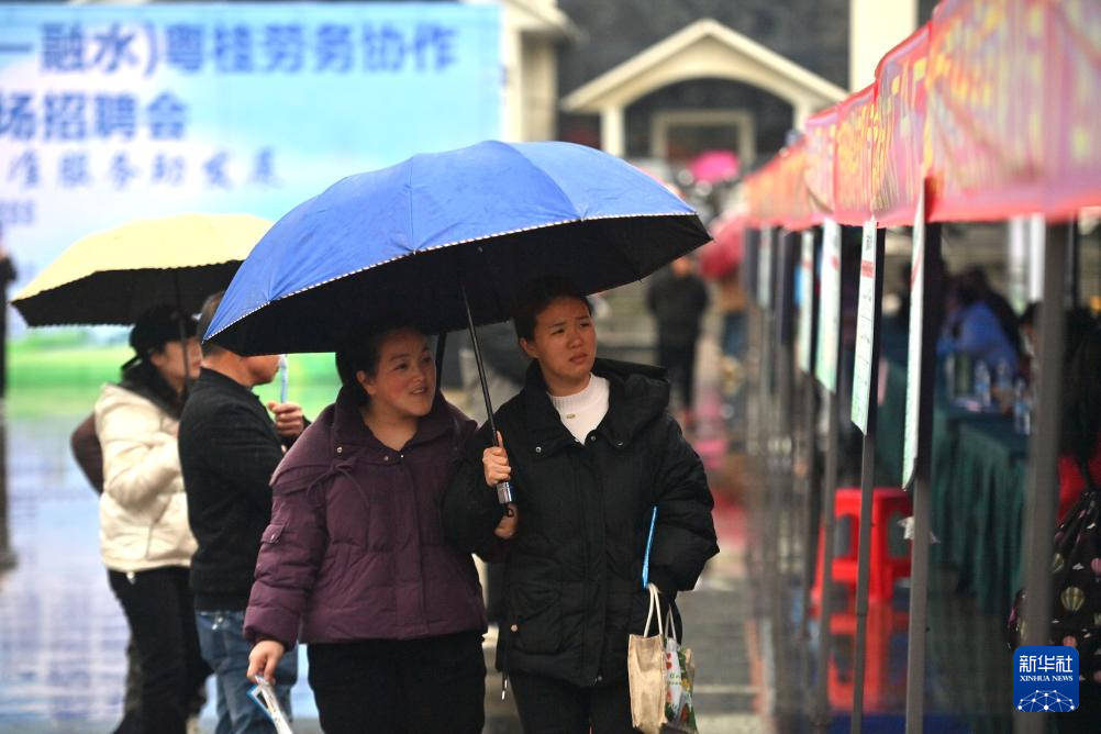 當日,廣西柳州市融水苗族自治縣舉行粵桂勞務協作暨春風行動專場招聘會,兩地60多家企業共提供數千個工作崗位,吸引眾多求職者冒雨前來應聘。