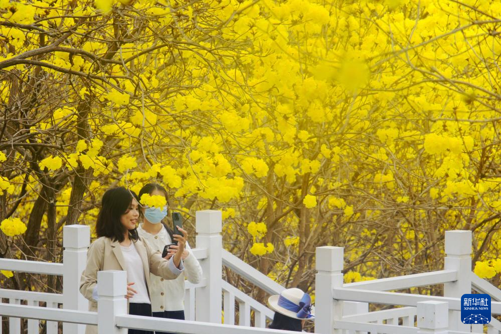 時下正是廣西南寧市青秀山風景區內的黃花風鈴木盛放時節,吸引了眾多游客前往觀賞。
