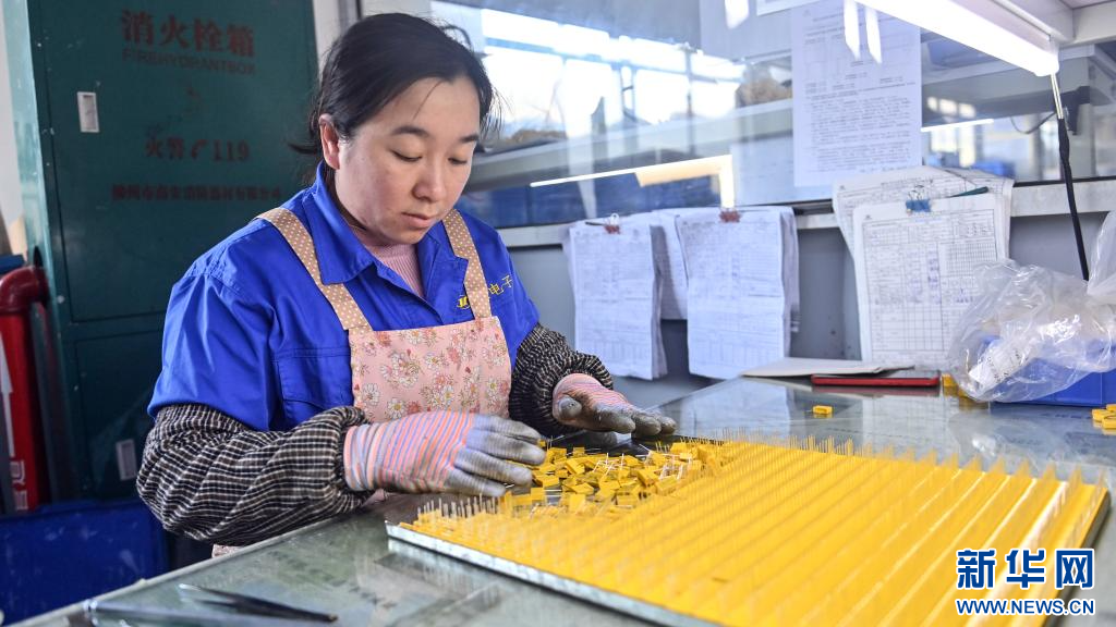 3月19日,在廣西金佳電子有限公司的生產車間,一名工人在組裝電容器。