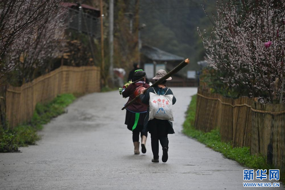 在廣西融水苗族自治縣桿洞鄉黨鳩村,村民勞作歸來(3月12日攝)。