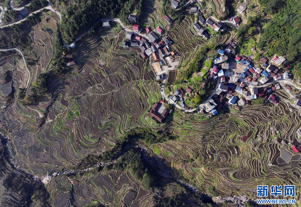 在廣西融安縣潭頭鄉新桂村,村民在田間勞作(3月21日攝,無人機照片)。