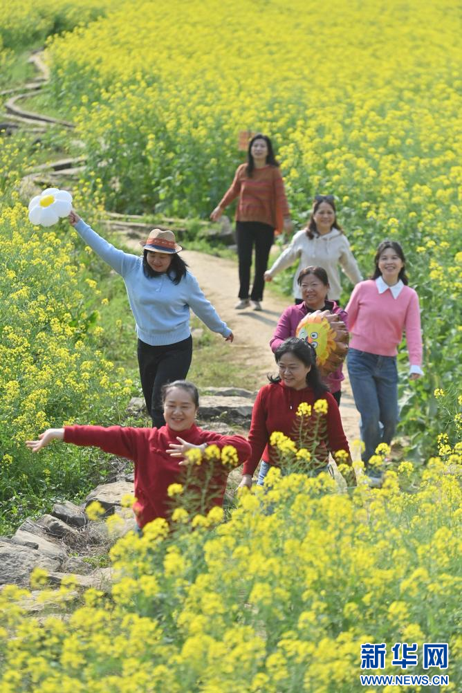 游客在廣西融水苗族自治縣融水鎮新國村的油菜花地踏青游玩(3月21日攝)。