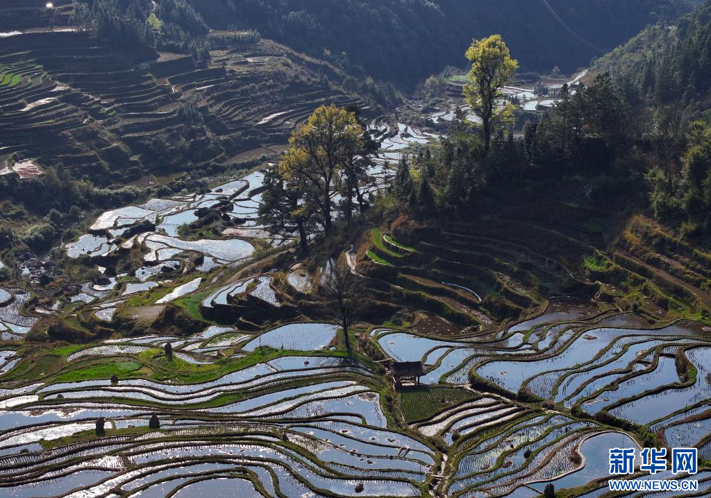 這是廣西融水苗族自治縣安太鄉小桑村的田園春景(3月21日攝,無人機照片)。