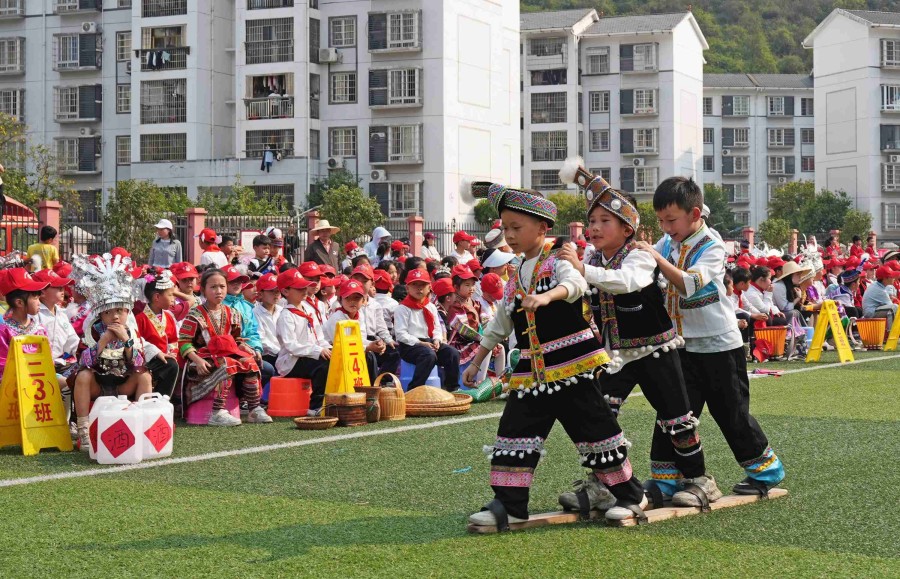 孩子們展示民族趣味運動項目——三人板鞋競速比賽。