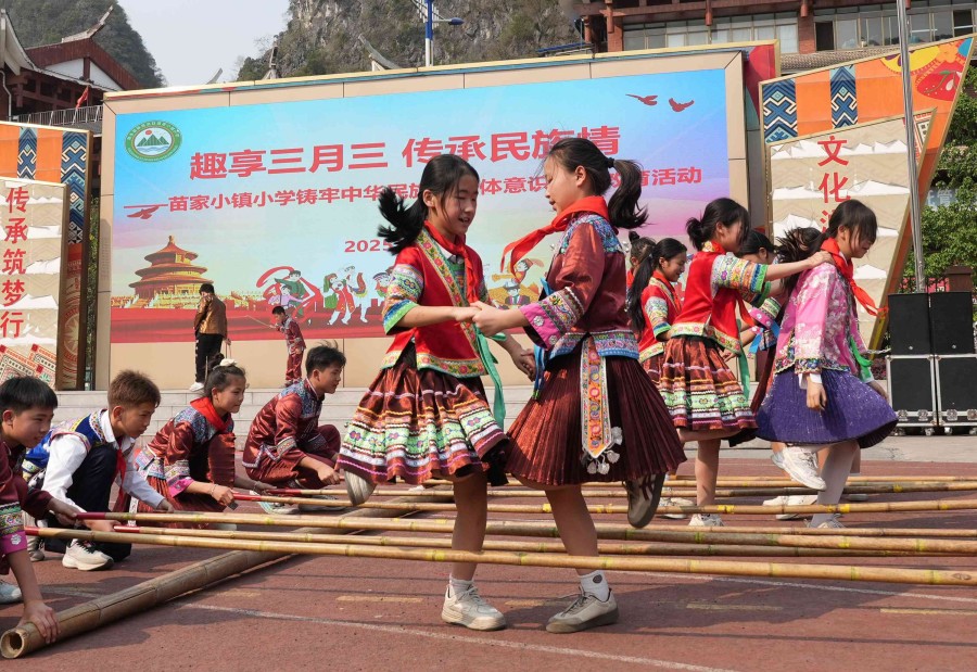 3月26日,廣西柳州市融水苗族自治縣苗家小學舉行三月三活動暨民族趣味運動會開幕式,各族少兒通過蘆笙踩堂、情景山歌對唱和民族趣味運動項目展示等豐富多彩的民族文體活動,喜迎三月三傳統節日。(龍濤)