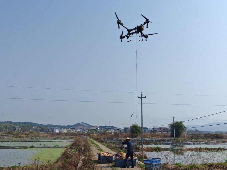 與此同時,示范區的藕田里,無人機滿載著一筐筐藕苗穿梭于田間,將藕苗投放至藕田深處,工人們將藕苗栽進泥土后,無人機通過搭載智能播撒系統實現精準施肥,不多時,就完成了一畝蓮藕的種植?!斑\用無人機運輸藕苗、撒播肥料,效率比以前大大提高了?!逼焦饏^藕蓮天下水生蔬菜產業核心示范區負責人丘啟送滿臉笑容。