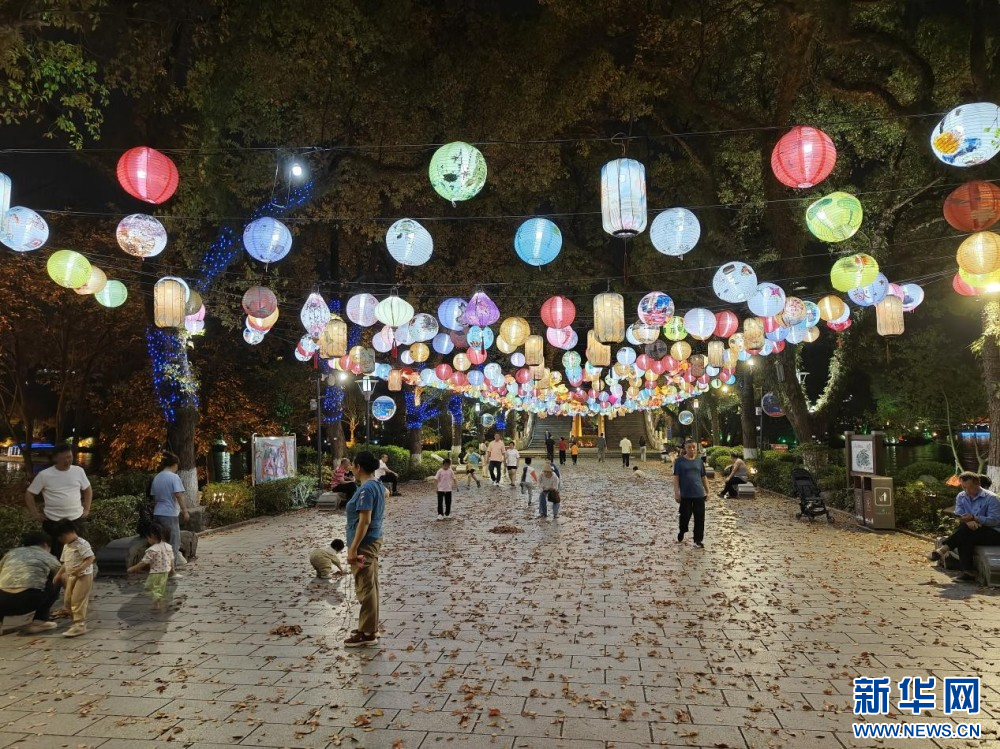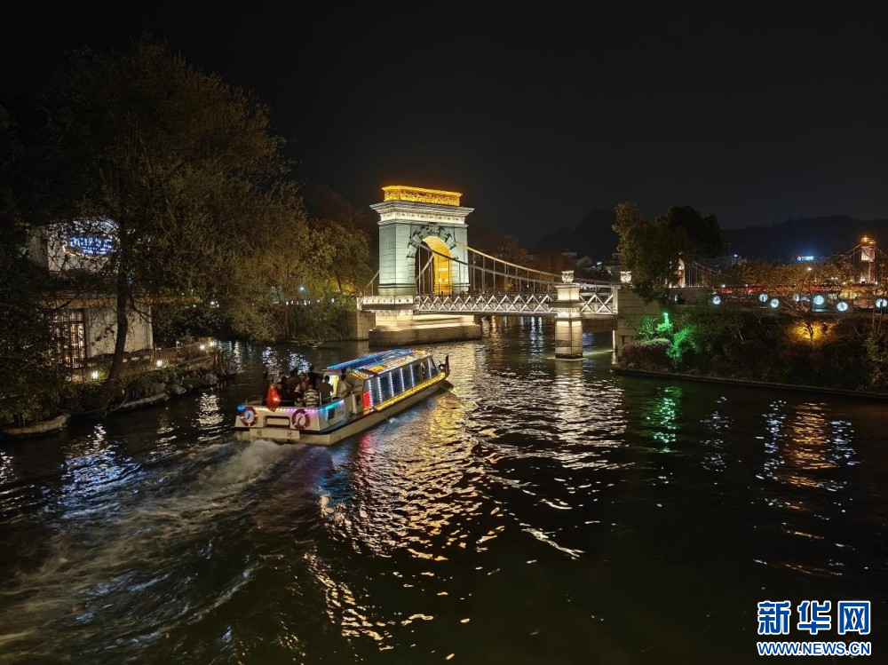 春夜,在廣西桂林兩江四湖景區,秀麗的景色與絢麗多彩的燈光交織,吸引著市民和游客前來休閑游玩。