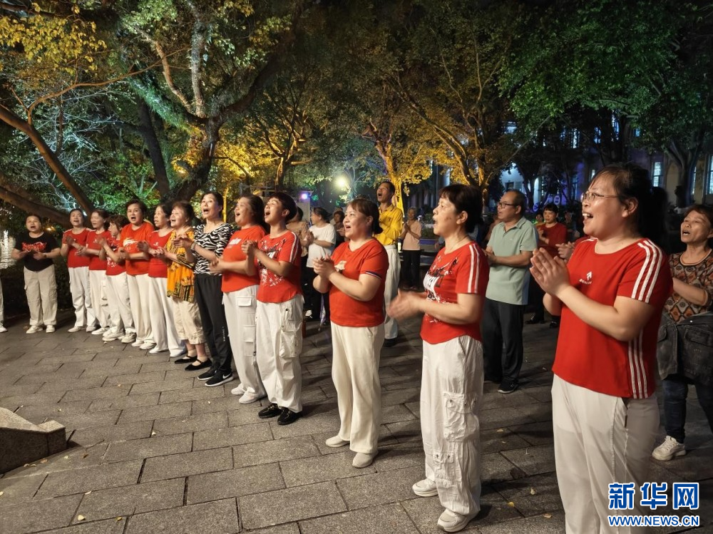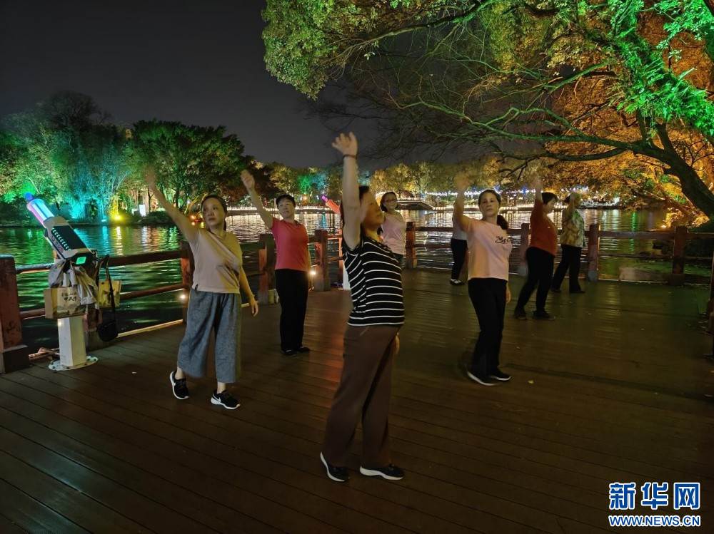 市民在榕湖邊翩翩起舞。