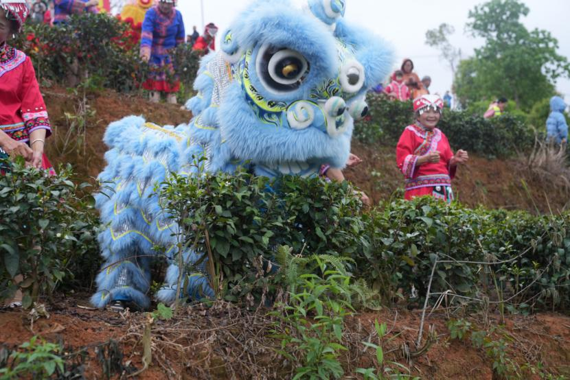 在陣陣鑼鼓聲中,百頭非遺醒獅與茶娘共同巡游茶壟。醒獅以靈巧動作“銜取”嫩葉,茶娘則現場演示采茶技藝。在云邊茶??偛?,國家級六堡茶制作技藝傳承人陳伯昌帶領制茶師將當日炒制的茶葉封存入壇。
