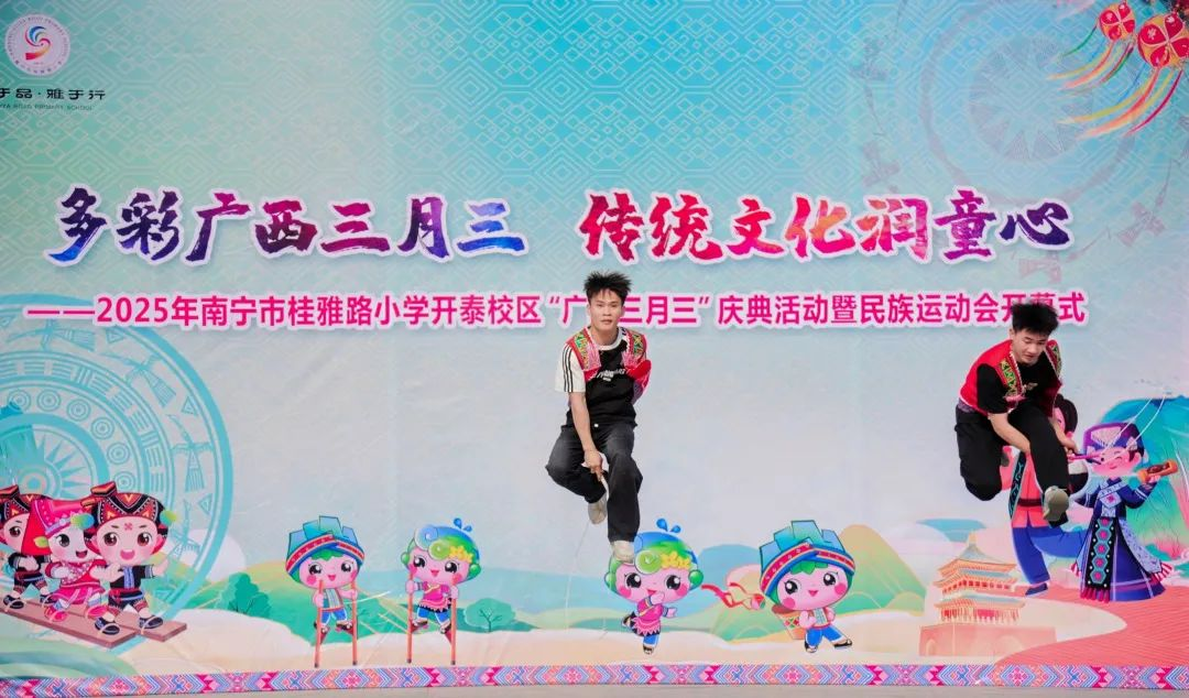學校合唱團的小阿哥和小阿妹們通過《壯鄉敬酒歌》的歌聲,傳遞著廣西各族兒女的熱情。在民族體育項目展示環節,高桿繡球、踩高蹺、滾鐵環等傳統運動輪番登場,生動詮釋了民族體育運動項目的精神內涵。學校特邀的花樣跳繩教練以翻飛的彩繩和靈動的舞姿贏得陣陣掌聲。在舞蹈環節,閃閃啦啦操隊的同學們將民族元素融入啦啦操舞蹈《唄儂情深》,呈現出獨特的舞蹈韻味。
