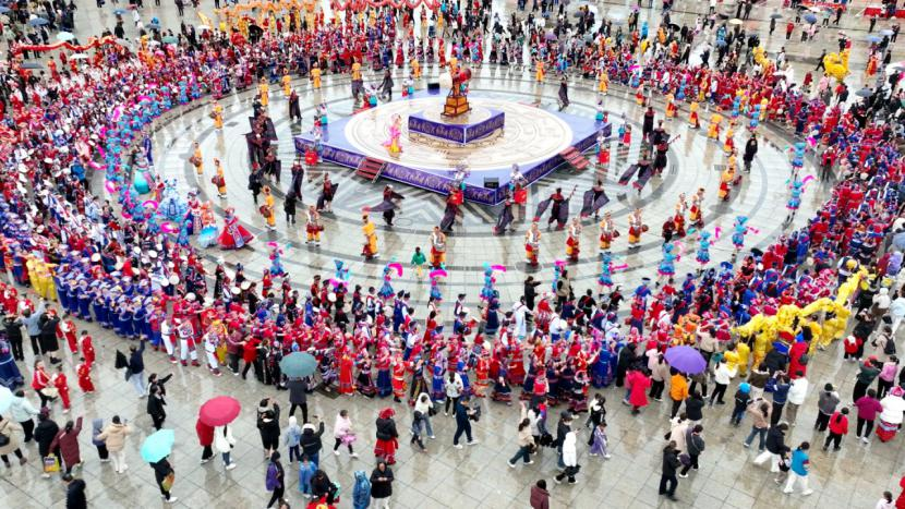 3月29日,廣西來賓市興賓區舉行“廣西三月三·八桂嘉年華”千面蜂鼓萬人舞民俗活動?;顒尤诤戏沁z傳承與創新表達,通過師公戲、壯族蜂鼓、踩堂舞、舞龍舞獅等特色節目,生動展現了壯族文化的深厚底蘊與中華民族文化的多元包容。(韋蘇 譚貴丹)