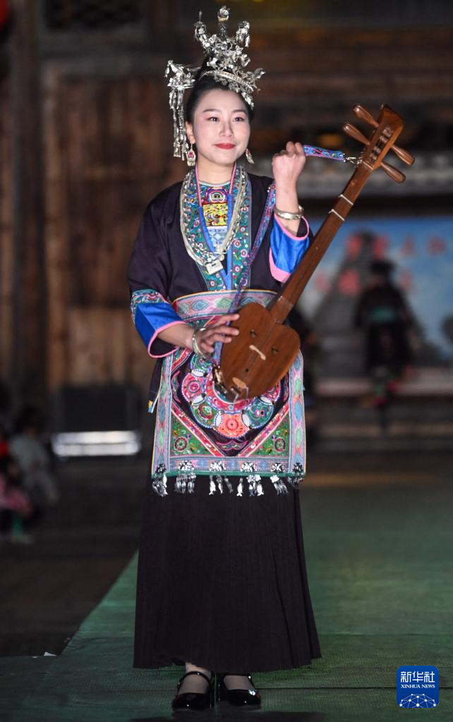 3月31日,在三江侗族自治縣鼓樓廣場,侗族群眾在T臺上展示民族服飾。