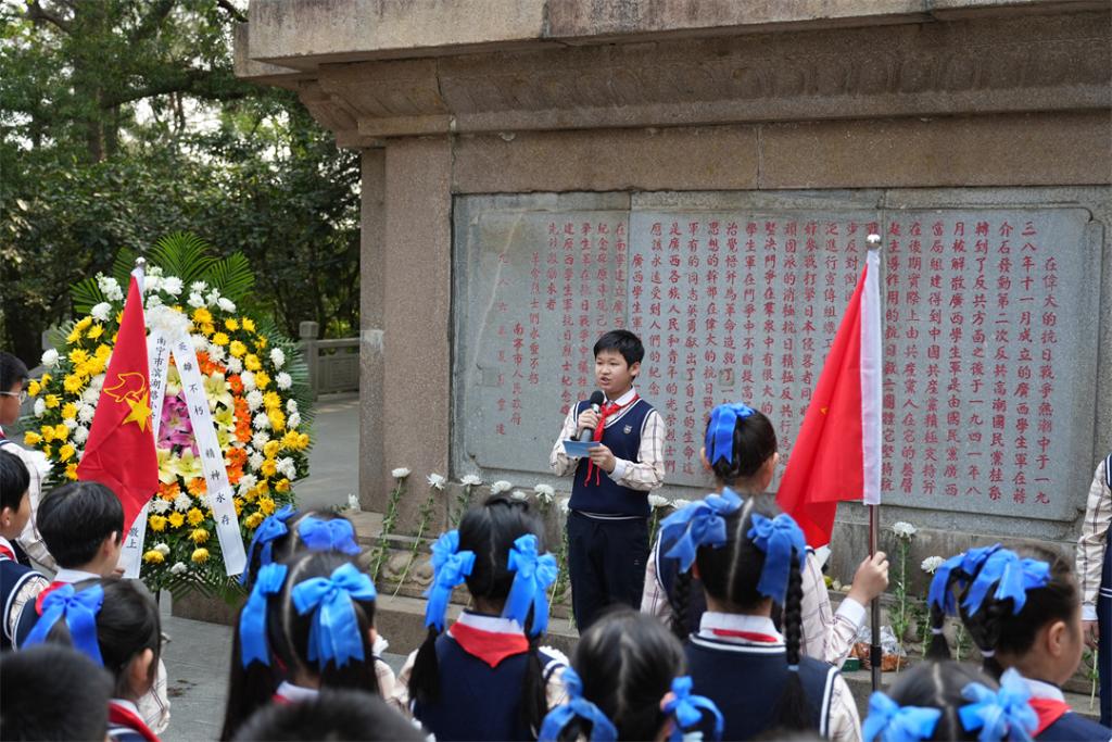 “同學們,我們胸前的紅領巾在春風中飄揚,手中的白菊在陽光下綻放,我們究竟是在緬懷一群什么樣的人?其實他們比我們大不了多少歲,為抵抗日本侵略,上世紀三十年代,數千廣西學子報名參軍,他們中最小的只有12歲,最大的不過20歲……”五(2)中隊代表用鏗鏘的聲音,講述了一位13歲小姑娘用稚嫩的肩膀扛起保家衛國重任的故事。約3分鐘的講述中,隊員們屏息凝神,有人悄悄攥緊了拳頭,有人眼眶泛紅。