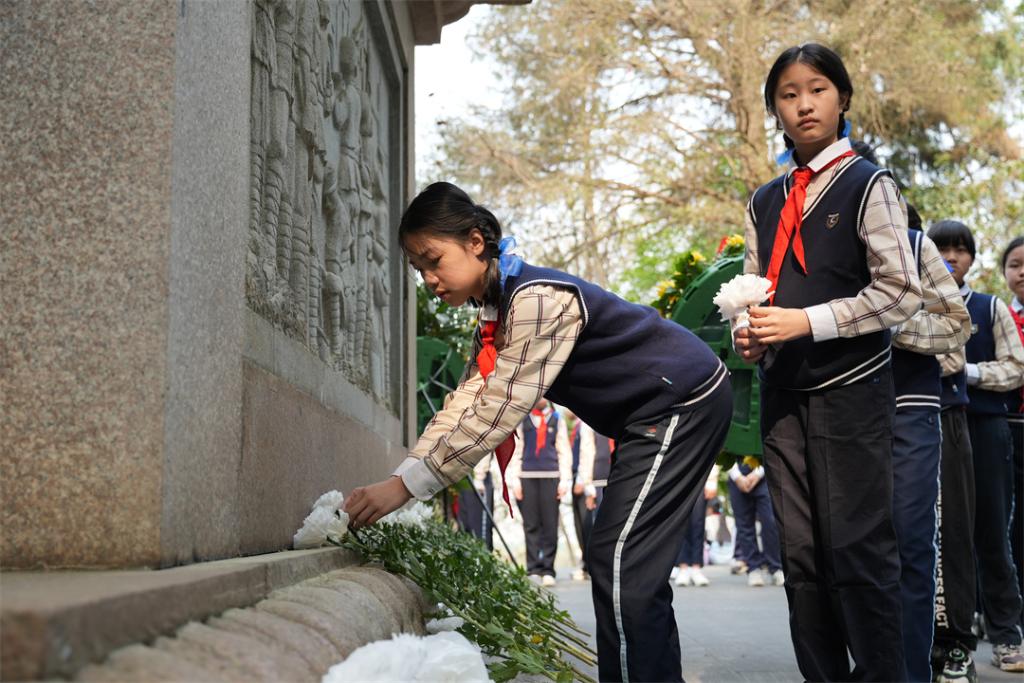 祭掃中,隊員們依次上前,將小白花輕輕放在紀念碑基座上,一朵朵白花,承載著孩子們的純真敬意,也象征著革命精神代代相傳。輕風拂過,白花如雪,無聲的對話跨越時空。