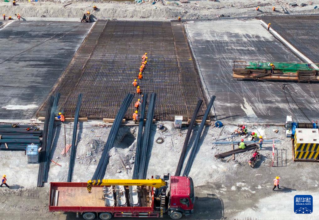4月15日,建設者在南寧抽水蓄能電站廠房內進行安裝作業(無人機照片)。