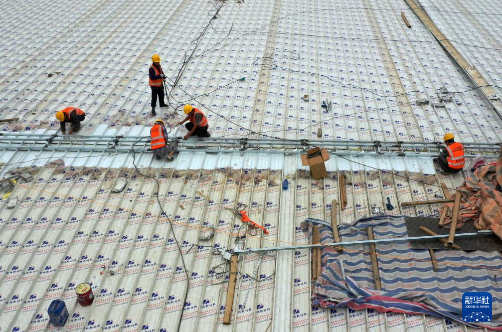4月17日,在南憑高鐵崇憑段憑祥東站,中鐵四局工人在裝修施工中(無人機照片)。