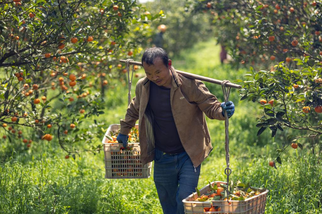 重慶市長壽區龍河鎮河堰村村民在果園內挑運采摘的柑橘(3月24日攝)。這一批柑橘經過分選、清洗、裝箱等流程后,將搭乘西部陸海新通道班列進入東南亞市場。新華社記者 黃偉 攝