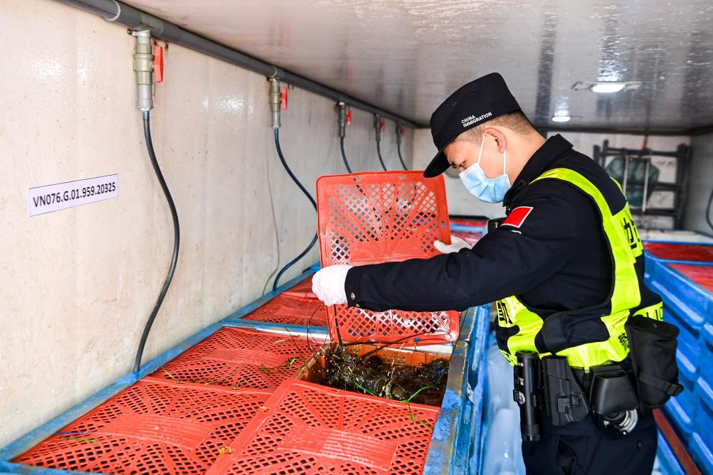在廣西東興口岸,邊檢人員對進口的鮮活水產品進行查驗(3月18日攝)。新華社記者 曹祎銘 攝