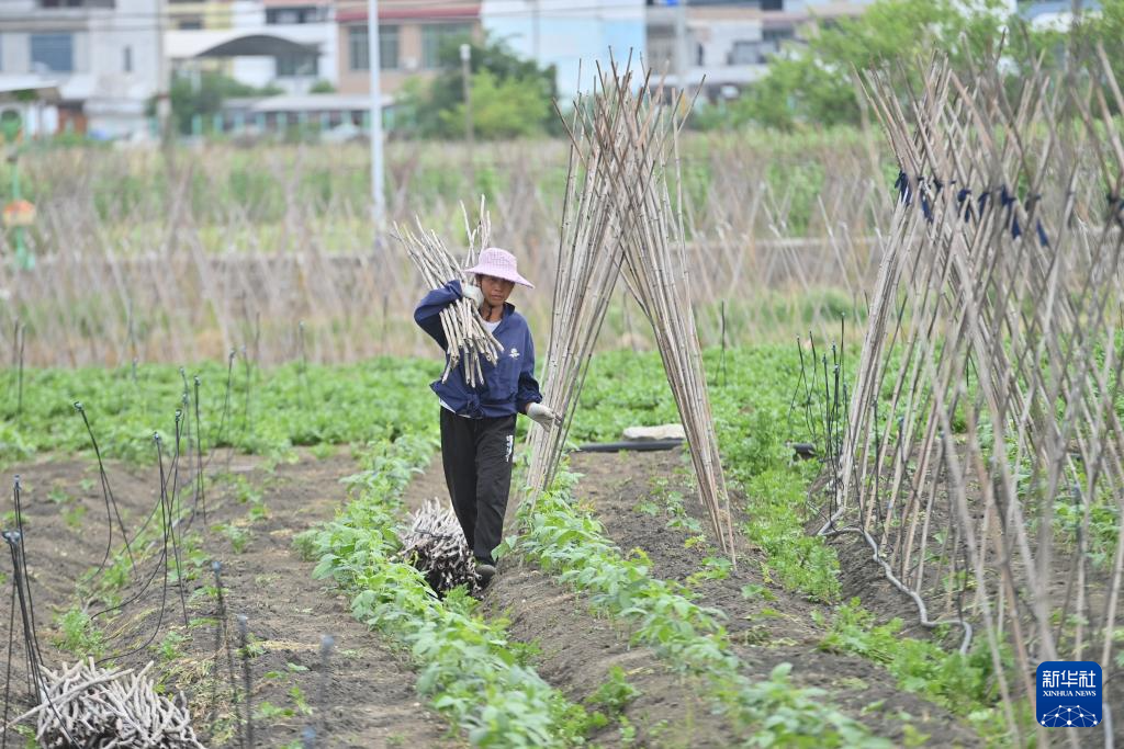 4月26日,在廣西柳州市柳江區三都鎮覺山村的蔬菜種植基地,村民在田間勞作。