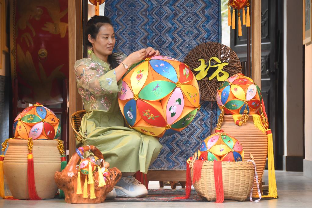 十幾年前,山東聊城的王秀芬來舊州村旅游時,被大街小巷掛滿的繡球深深吸引。一番思索后,計算機專業出身的她決定“跨界”,留在了依山傍水的舊州村,投身到繡球制作事業中。