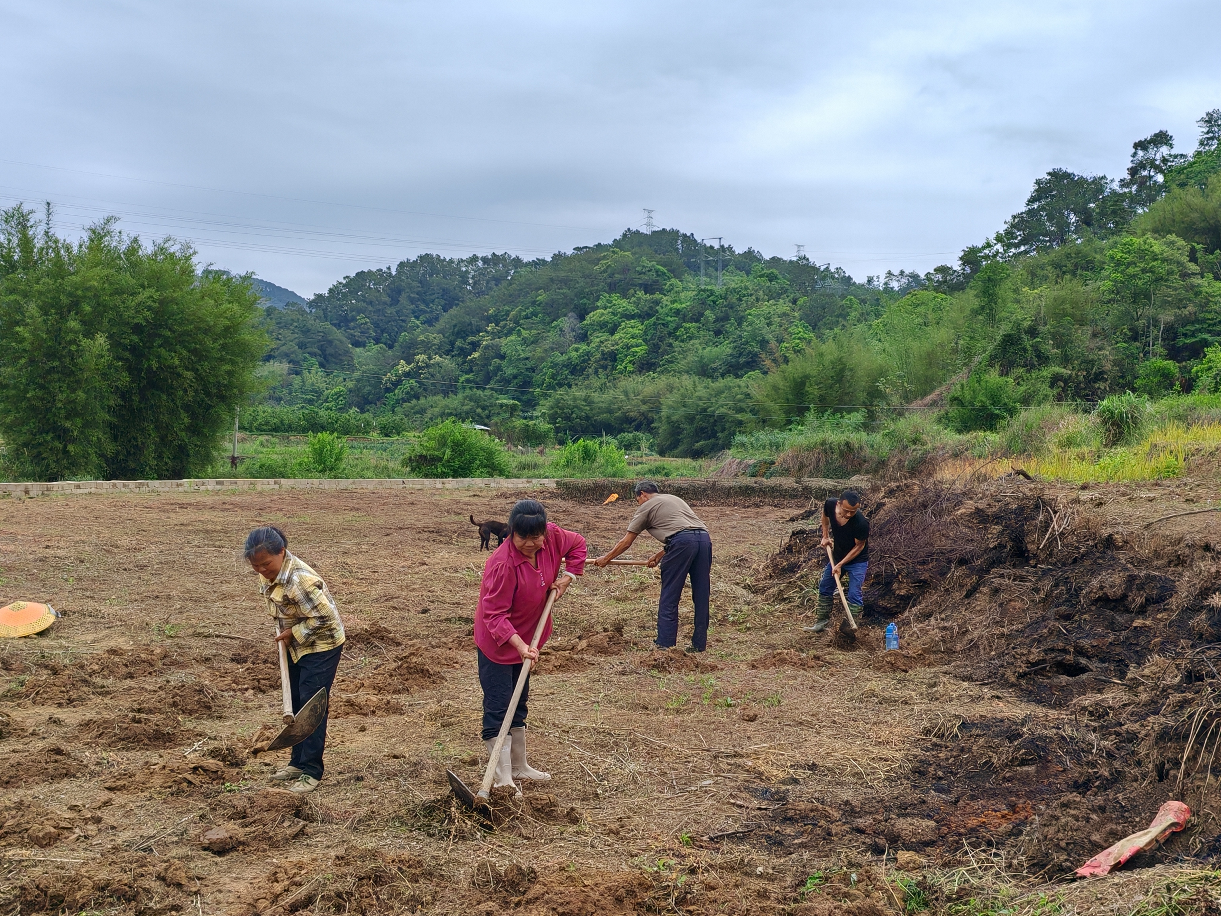 4月28日,在賀州市昭平縣昭平鎮福登村大段小組,10多名群眾正在種植木薯,挖溝做畦、砍斷種莖、斜插蓋土。