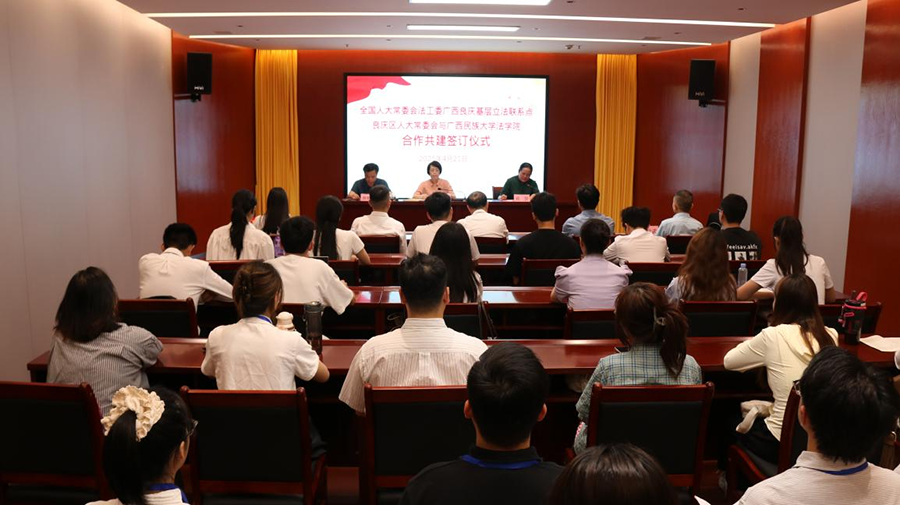 近日,南寧市良慶區人大常委會與廣西民族大學法學院在廣西良慶基層立法聯系點活動陣地簽訂合作協議,雙方將在民族團結、服務自貿區立法、服務涉外立法等領域深化協作。簽約儀式后,廣西民族大學法學院同步啟動第二屆“相思湖”模擬立法大賽。