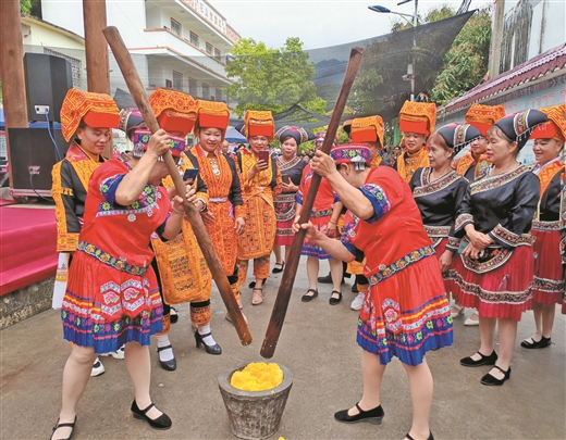 寧明縣愛店鎮堪愛村各族群眾一起舂糍粑。 陳桂梅、黃建崇/攝