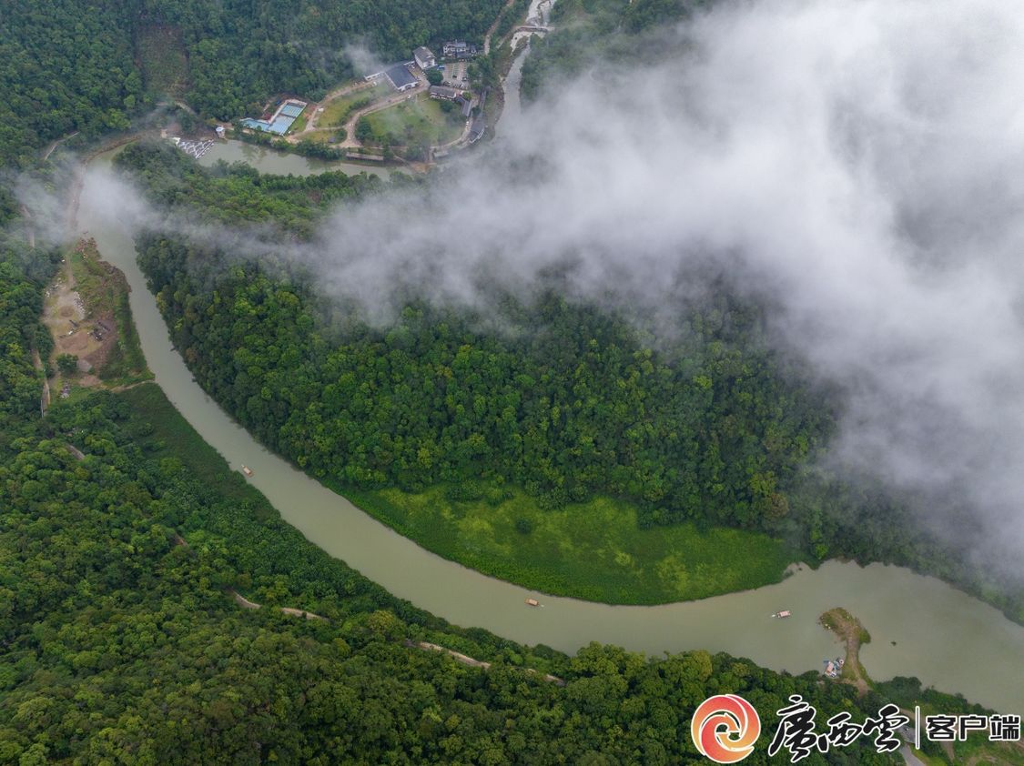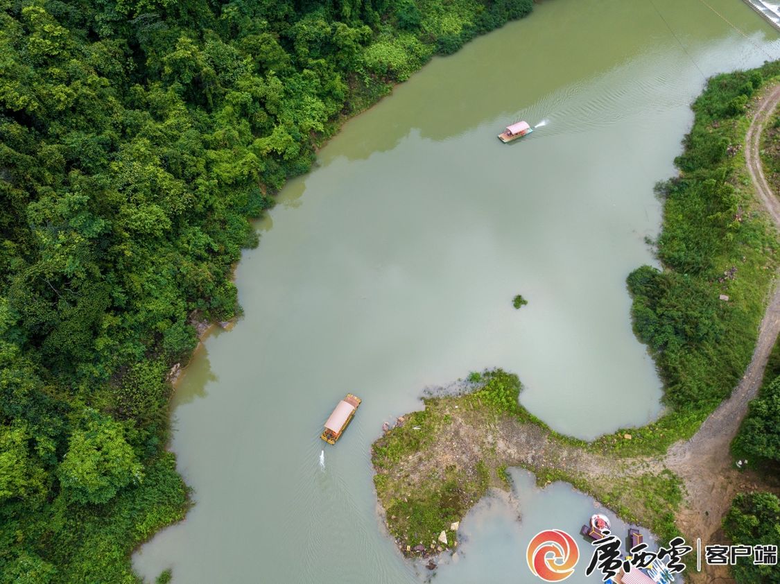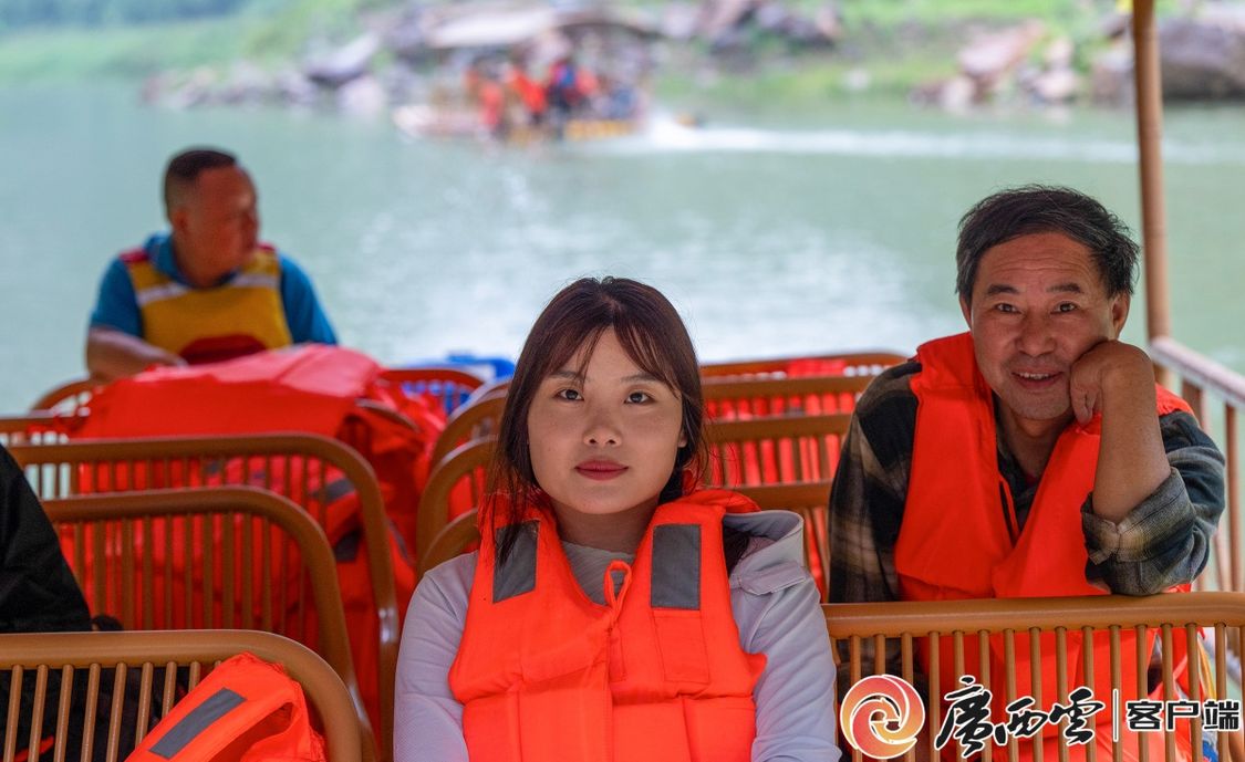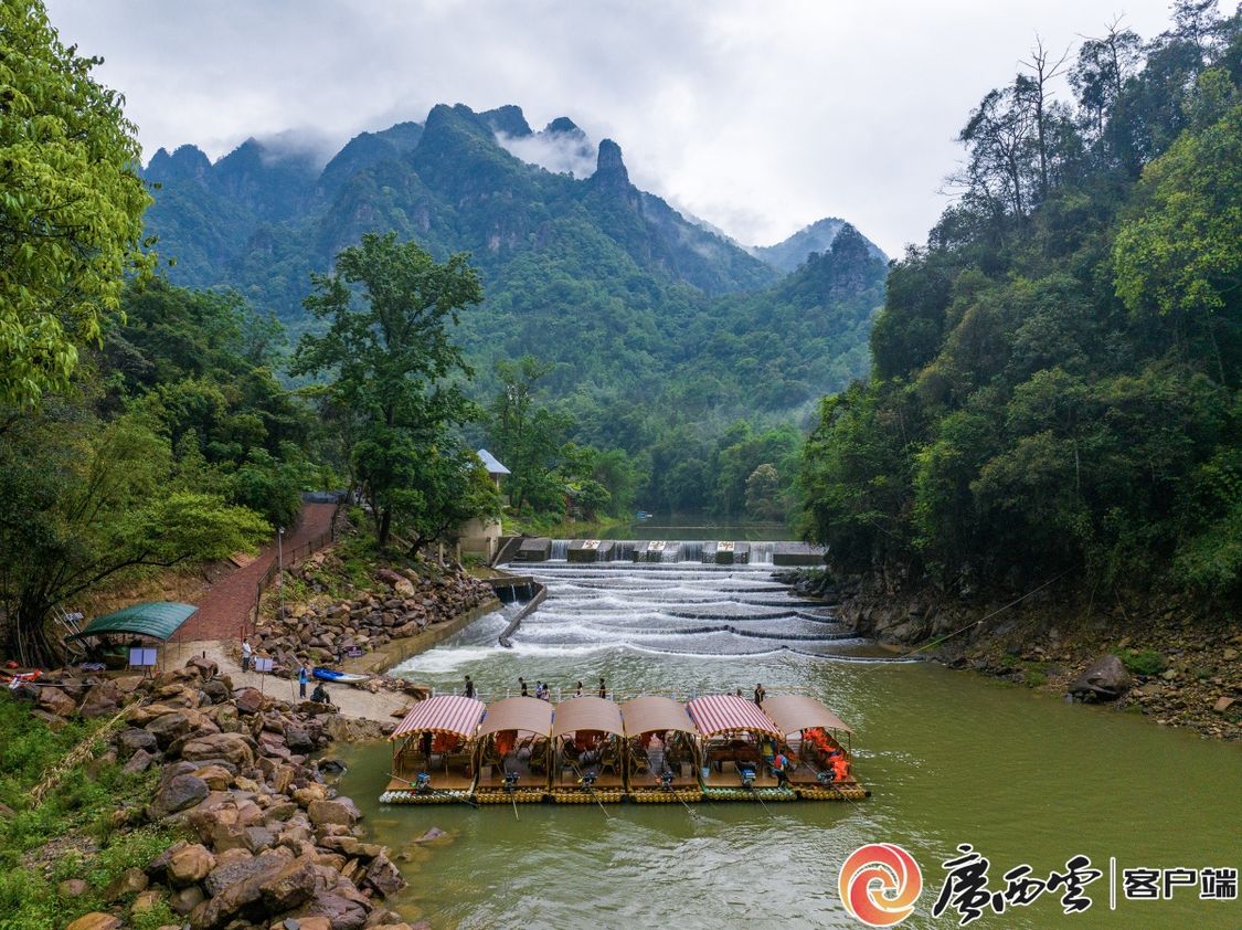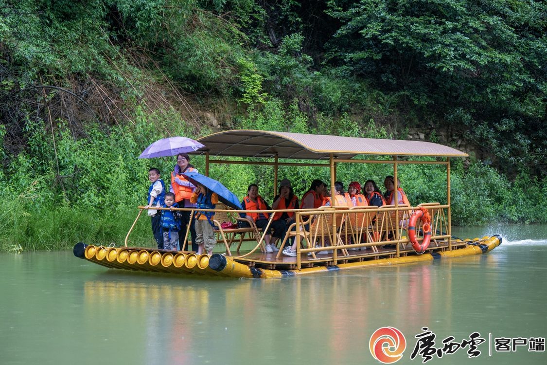5月10日,在來賓市金秀瑤族自治縣長垌鄉圣堂湖景區里,游客乘坐竹筏游玩,感受山水自然之美。