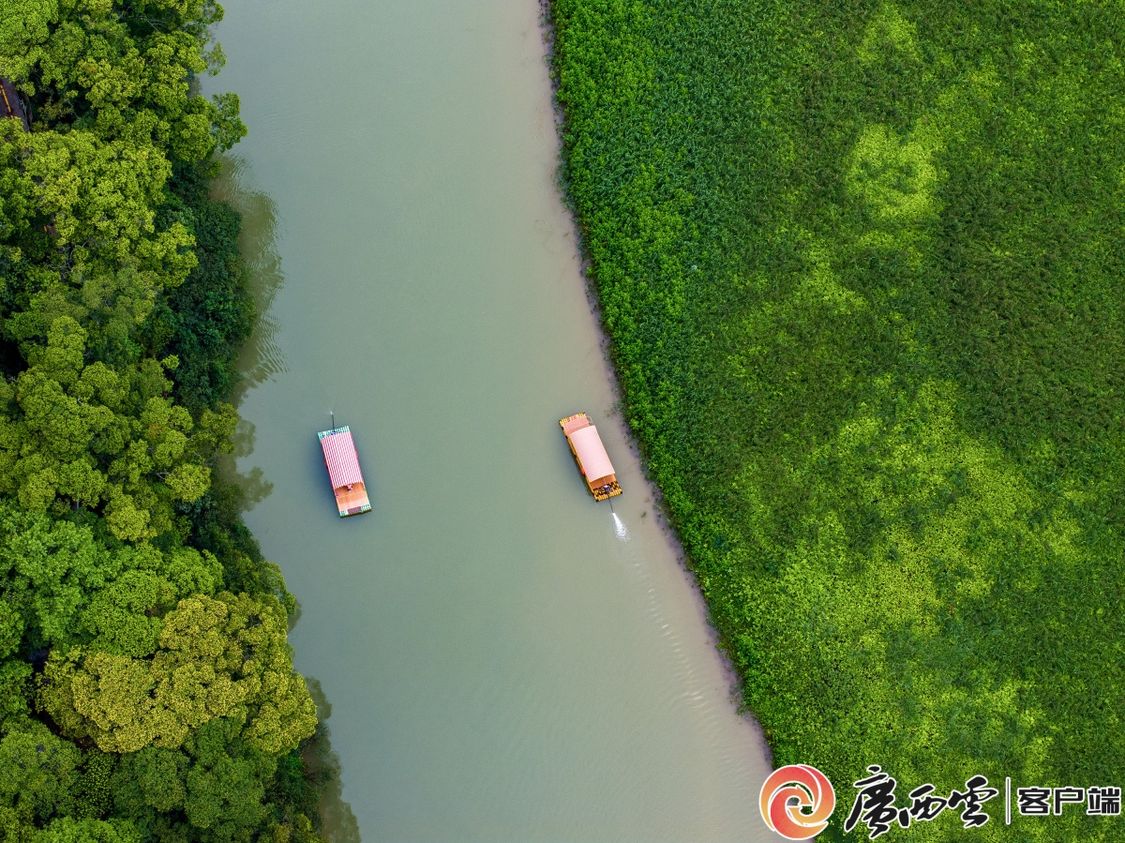 游客在圣堂湖景區游客乘坐竹筏游玩,感受山水自然之美。何華文 攝