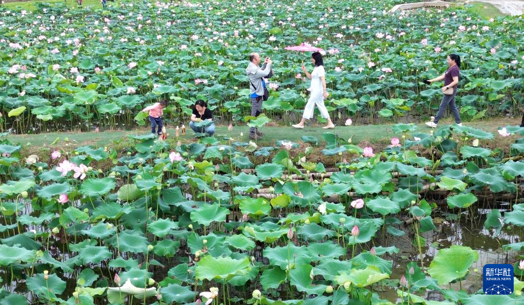 5月25日,游客在廣西賀州市平桂區鵝塘鎮栗木村一處鄉間荷塘觀賞荷花(無人機照片)。