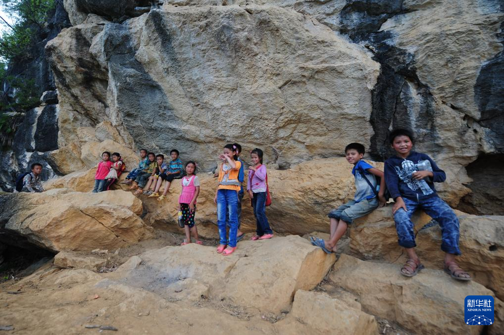 在廣西大化瑤族自治縣板升鄉弄雷村哈寶屯,11歲的蒙富松(右二)坐在懸崖上休息(2013年5月28日攝)。
