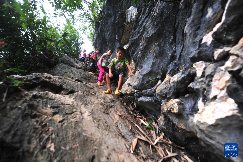 在廣西大化瑤族自治縣板升鄉弄雷村哈寶屯,10歲的蒙富松(左一)爬懸崖去學校讀書(2012年9月3日攝)。