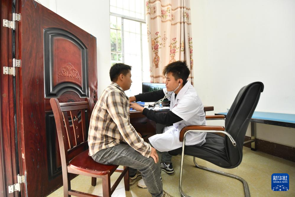 在廣西大化瑤族自治縣板升鄉弄雷村衛生室,村醫蒙富松(右)在給村民看?。?023年5月24日攝)。