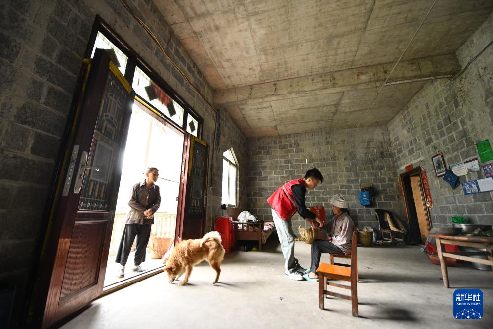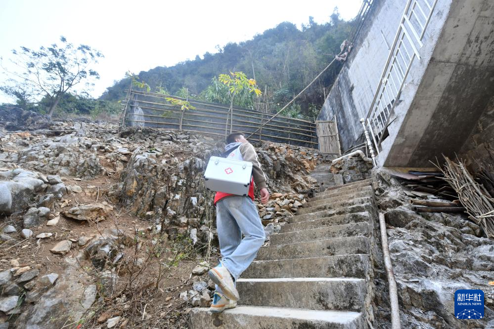 在廣西大化瑤族自治縣板升鄉弄雷村,村醫蒙富松進村入戶給村民看?。?025年1月19日攝)。