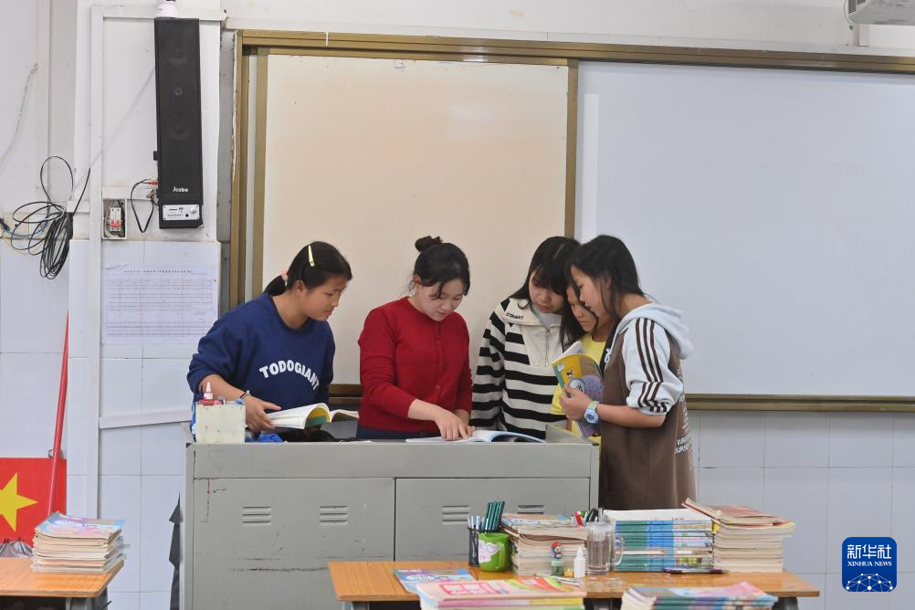 在廣西大化瑤族自治縣板升鄉初級中學,蒙秋艷(左二)輔導學生學習(2025年5月27日攝)。