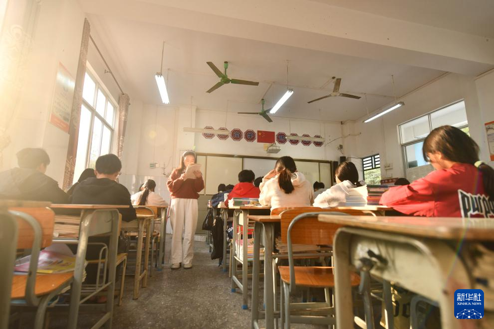 在廣西大化瑤族自治縣板升鄉初級中學,蒙秋艷給學生上課(2025年4月2日攝)。