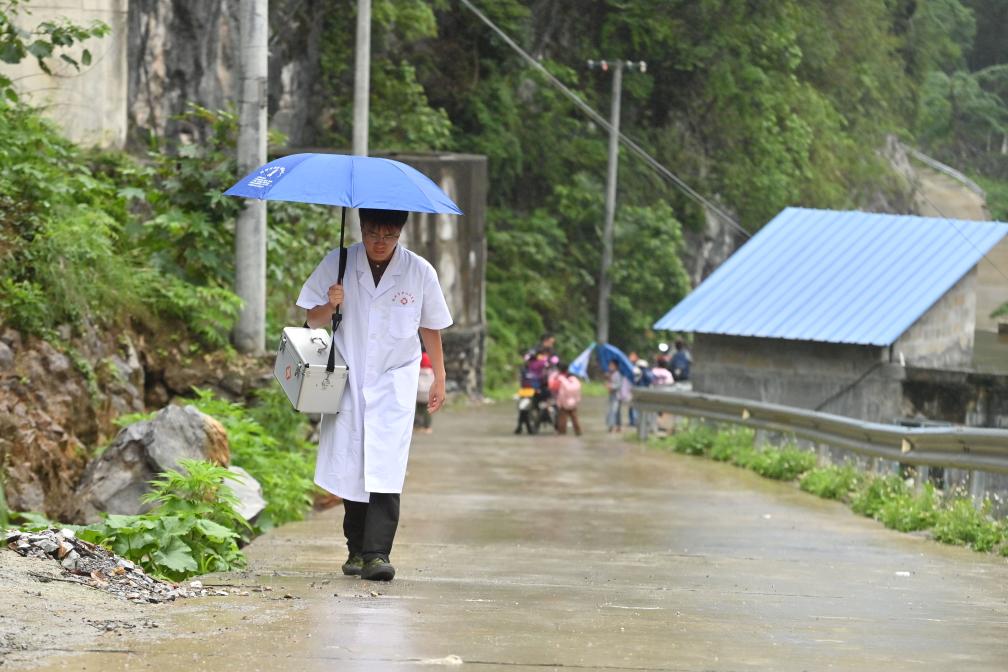 在廣西大化瑤族自治縣板升鄉弄雷村,村醫蒙富松走在村道上,準備進村入戶給村民看?。?025年5月27日攝)。