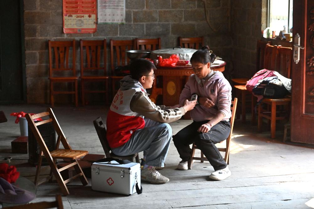 在廣西大化瑤族自治縣板升鄉弄雷村,村醫蒙富松進村入戶給村民看?。?025年1月19日攝)。