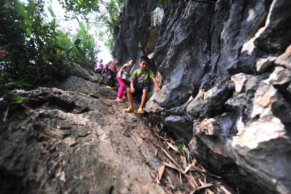 在廣西大化瑤族自治縣板升鄉弄雷村哈寶屯,10歲的蒙富松(左一)爬懸崖去學校讀書(2012年9月3日攝)。