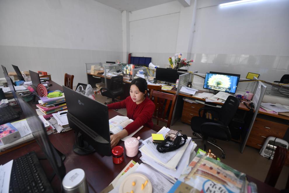 蒙秋艷在廣西大化瑤族自治縣板升鄉初級中學的辦公室備課(2025年5月27日攝)。