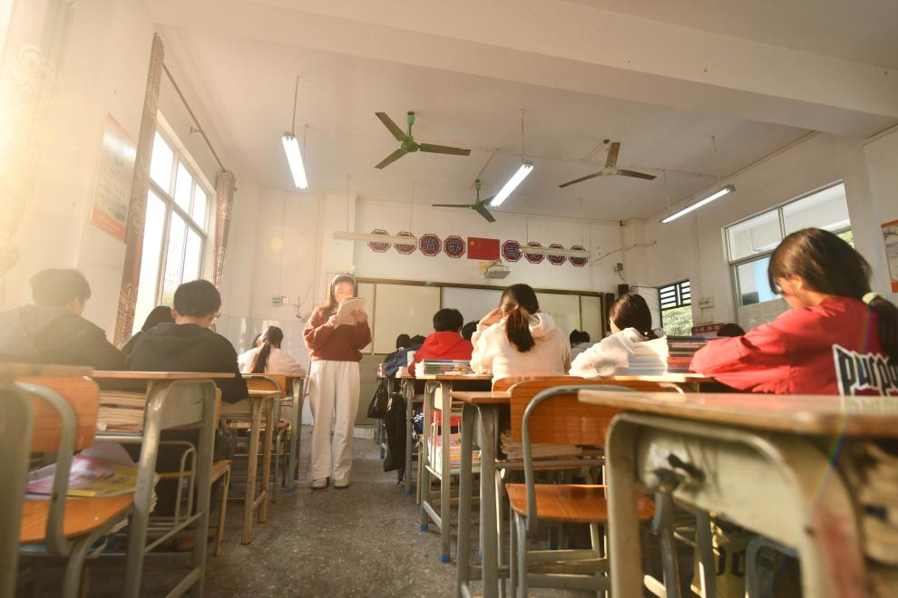 蒙秋艷在廣西大化瑤族自治縣板升鄉初級中學上課(2025年4月2日攝)。