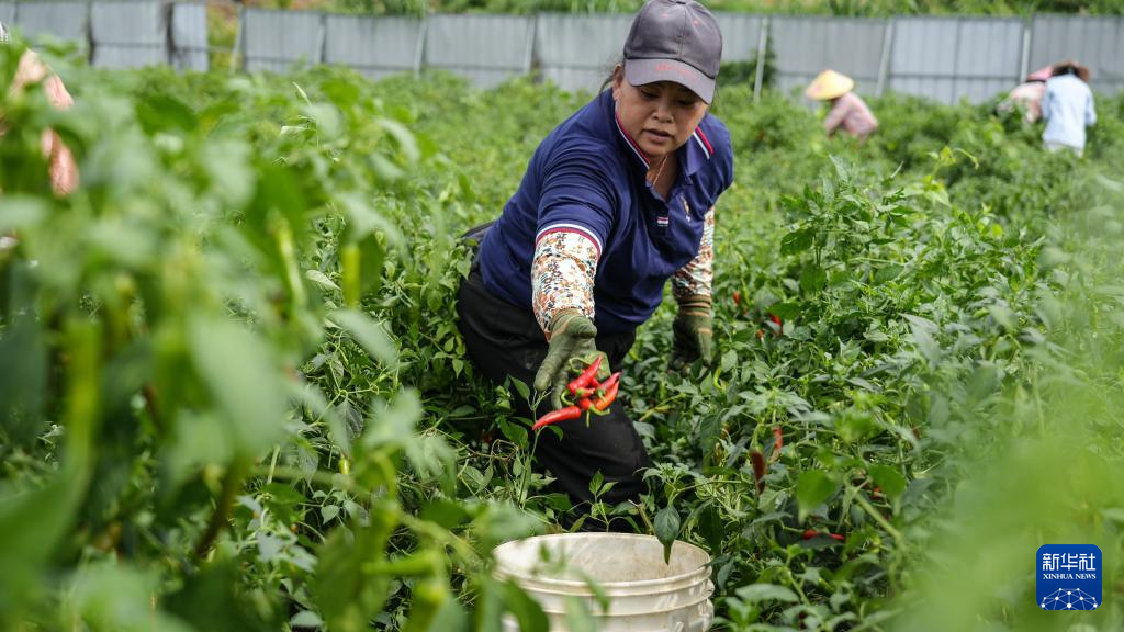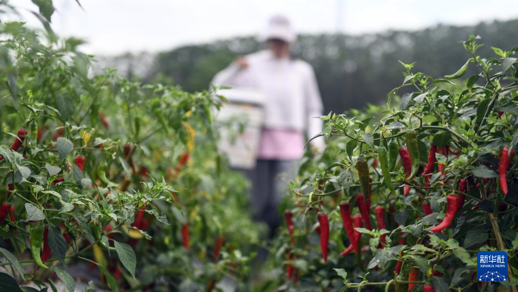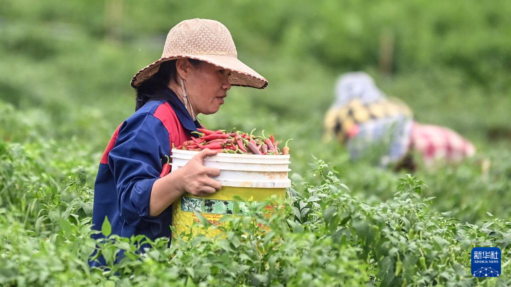 6月12日,在欽州市欽南區沙埠鎮油埠村,農民在田間收辣椒。