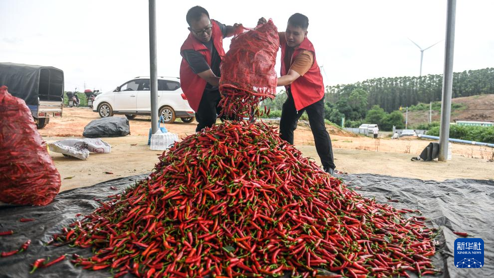 6月12日,在欽州市欽南區沙埠鎮油埠村,兩名志愿者在堆放農民收獲的辣椒。