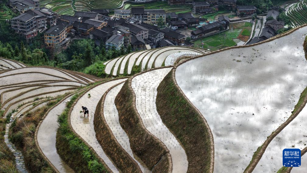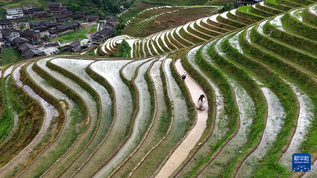 連日來,廣西桂林市龍勝各族自治縣龍脊梯田轄區內的各村寨進入夏種農忙時節,村民忙著耙田、插秧,梯田上一派忙碌景象。