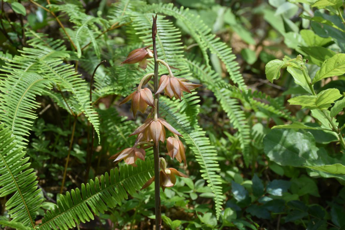 經現場實地觀測,這9株無葉美冠蘭身姿挺拔,褐紅色花莖纖細勁挺,株高介于20至40厘米之間;單株著生花苞6至15枚不等,部分花苞緊裹呈橢圓狀待放,部分已完全舒展綻放。唇瓣與花瓣層疊有序,于山野間縈繞著清雅香氣。其植株形態與周邊灌叢渾然一體,展現出野生蘭科植物對生態環境的高度適應性,以不加雕琢的自然姿態,詮釋“野性”之美的生態意蘊。