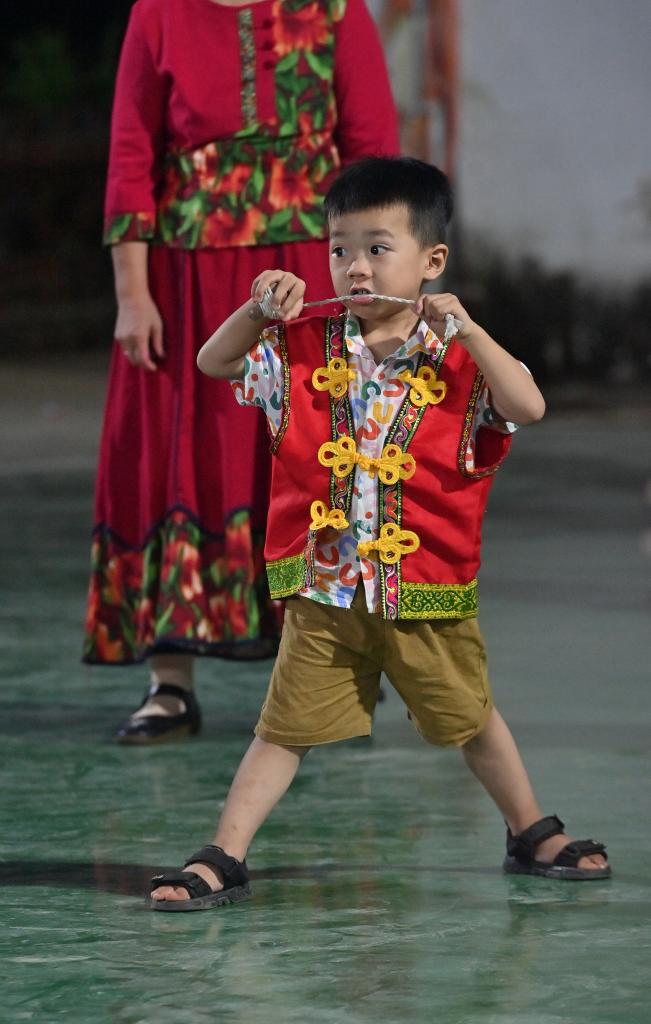 在大苗山深處的烏英苗寨:4歲的卜江輝,用雙手當蘆笙,跟著爸爸的節奏吹起來;6歲的吳采薇用零食當道具,跟著媽媽的步伐舞動。