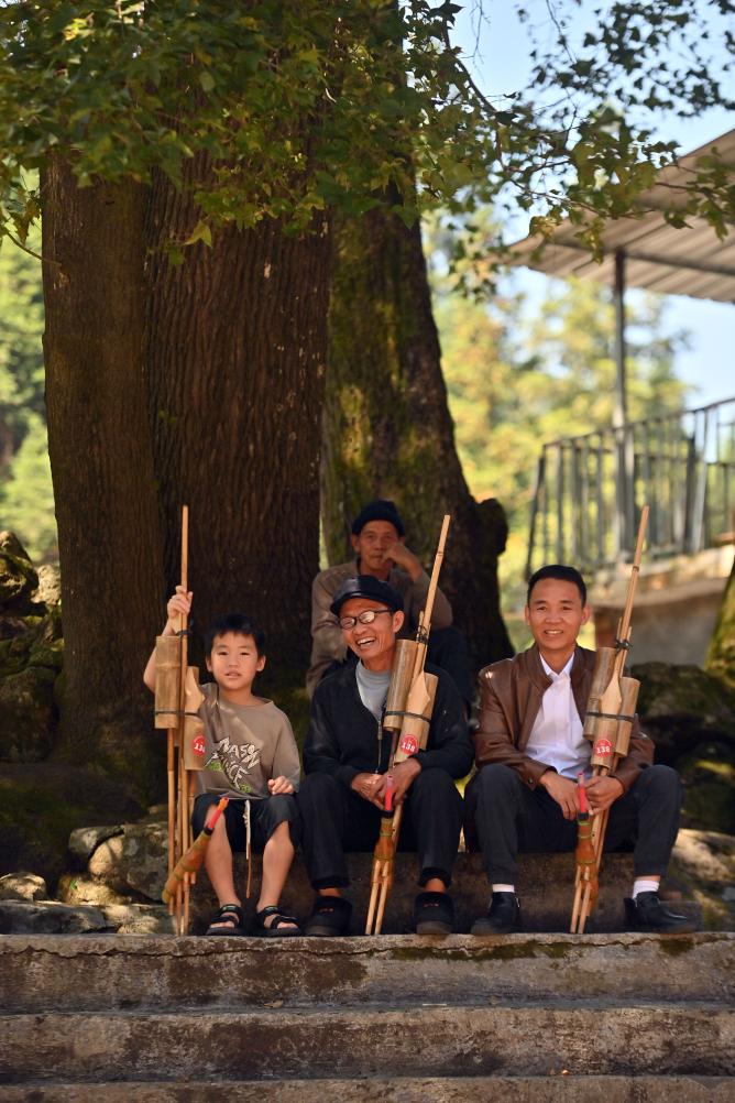 蘆笙是苗族人們最愛的樂器,是苗族人們的精神寄托,是苗族文化傳承的載體。在烏英苗寨,蘆笙文化歷史悠久。當地人說,沒有不會吹蘆笙的烏英人,烏英人的血液里都流淌著蘆笙。烏英苗寨蘆笙隊隊長梁秀前和我說,小時候,沒有人教他吹蘆笙,自己天天跟著大人吹,慢慢就會了?,F在,他11歲的兒子梁文雄,也不需要他教,自己慢慢學會了吹蘆笙。