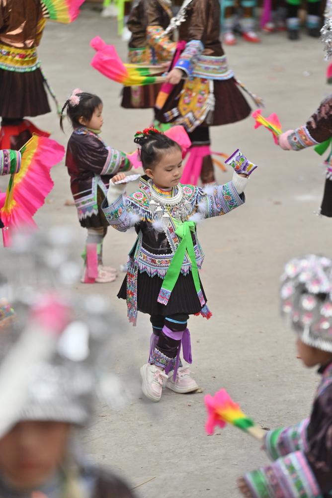 在廣西柳州市融水苗族自治縣桿洞鄉烏英苗寨,6歲的吳采薇用零食當道具,和大人一起跳蘆笙踩堂舞(2025年1月31日攝)。